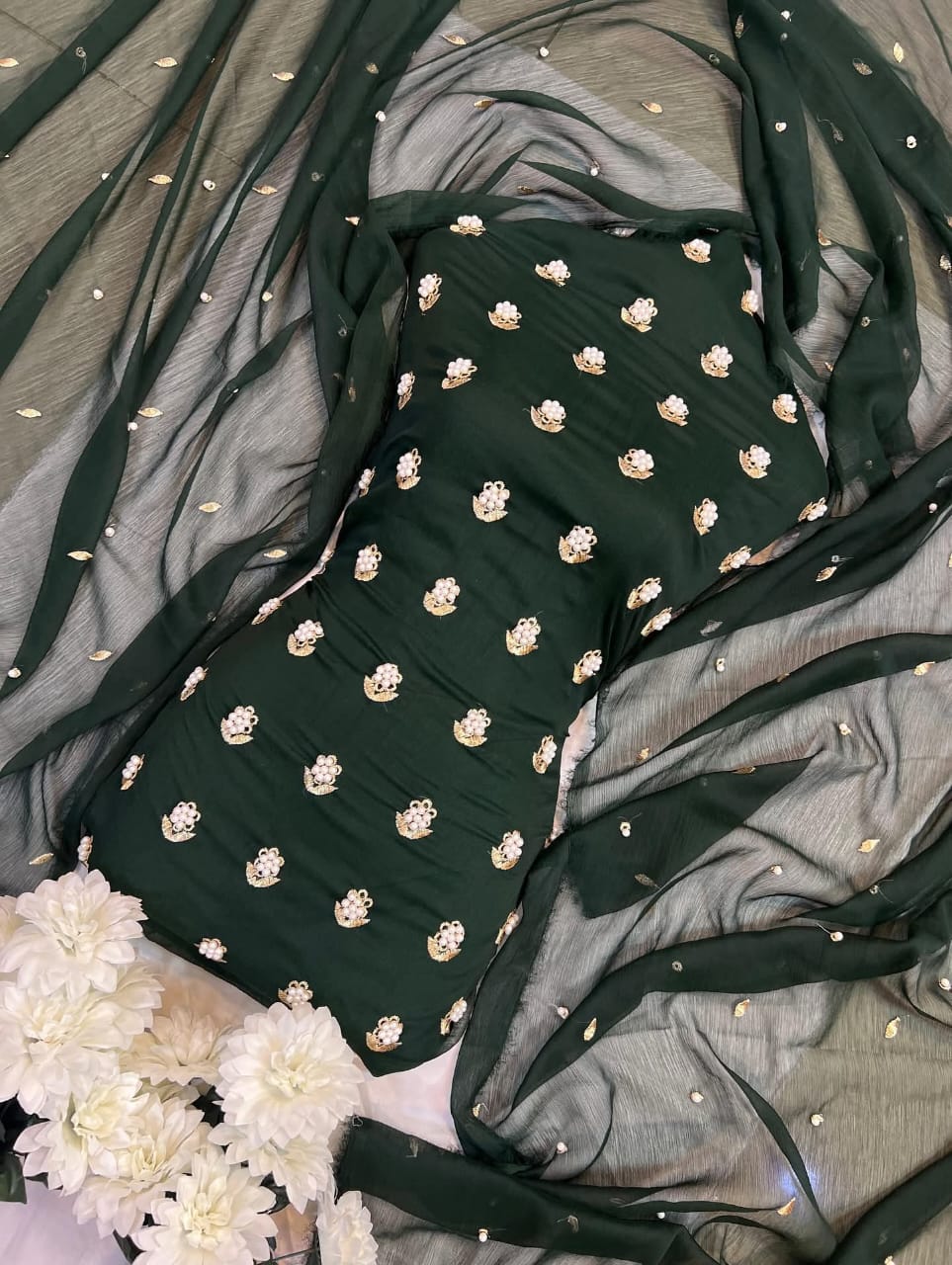 7Pearls Luxury Soft Chiffon 3-PiecePremium unstitched chiffon suit with 1.25 yards embroidered pearl front, 4.25 yards pearl & golden work chiffon for back/sleeves/dupatta, and 2.5 yards soft malai trouser. Perfect for weddings, mehndi, and elegant evening wear.