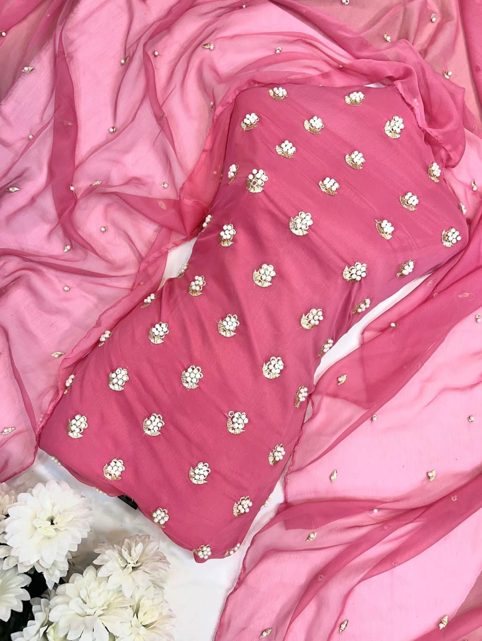 7Pearls Luxury Soft Chiffon 3-PiecePremium unstitched chiffon suit with 1.25 yards embroidered pearl front, 4.25 yards pearl & golden work chiffon for back/sleeves/dupatta, and 2.5 yards soft malai trouser. Perfect for weddings, mehndi, and elegant evening wear.