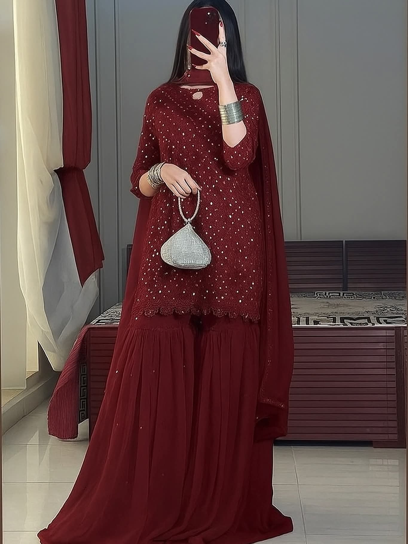 S-F 007HEAVY EMBROIDERY CHIFFON 3PCS UNSTICH DRESS (MEHROON)