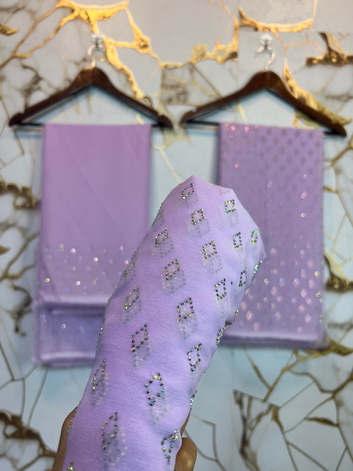 Product Detail: Fabric: Soft Chiffon with Turkish Small Crystal Work Shirt: Width: 44 inches, Length: 2.5 yards Dupatta: Double borders on both sides, Same length and width as shirt Trouser: 2.5 yards matching malai trouser Crystal Work: Premium Electric-Pasted Turkish Crystals for a Shiny, Luxurious Finish