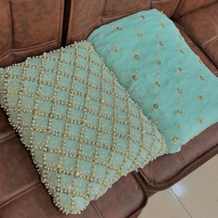 Details New Boxes pearls chiffon dress 👗 Fabric: pure chiffon 1.25 yards chiffon pearls embroidery work shirt 2 yards chiffon pearls work back & seleeves // 2.5 yards chiffon pearls embroidery work Dupta//Plain malai crap trouzer Premium Quality Dress for Formal Wearings, Wedding & Party Wears.