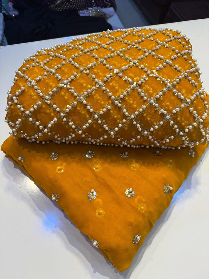 Details New Boxes pearls chiffon dress 👗 Fabric: pure chiffon 1.25 yards chiffon pearls embroidery work shirt 2 yards chiffon pearls work back & seleeves // 2.5 yards chiffon pearls embroidery work Dupta//Plain malai crap trouzer Premium Quality Dress for Formal Wearings, Wedding & Party Wears.