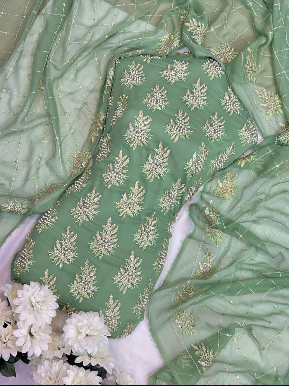 7Pearls Luxury Soft Chiffon 3-PiecePremium unstitched chiffon suit with 1.25 yards embroidered pearl front, 4.25 yards pearl & golden work chiffon for back/sleeves/dupatta, and 2.5 yards soft malai trouser. Perfect for weddings, mehndi, and elegant evening wear.