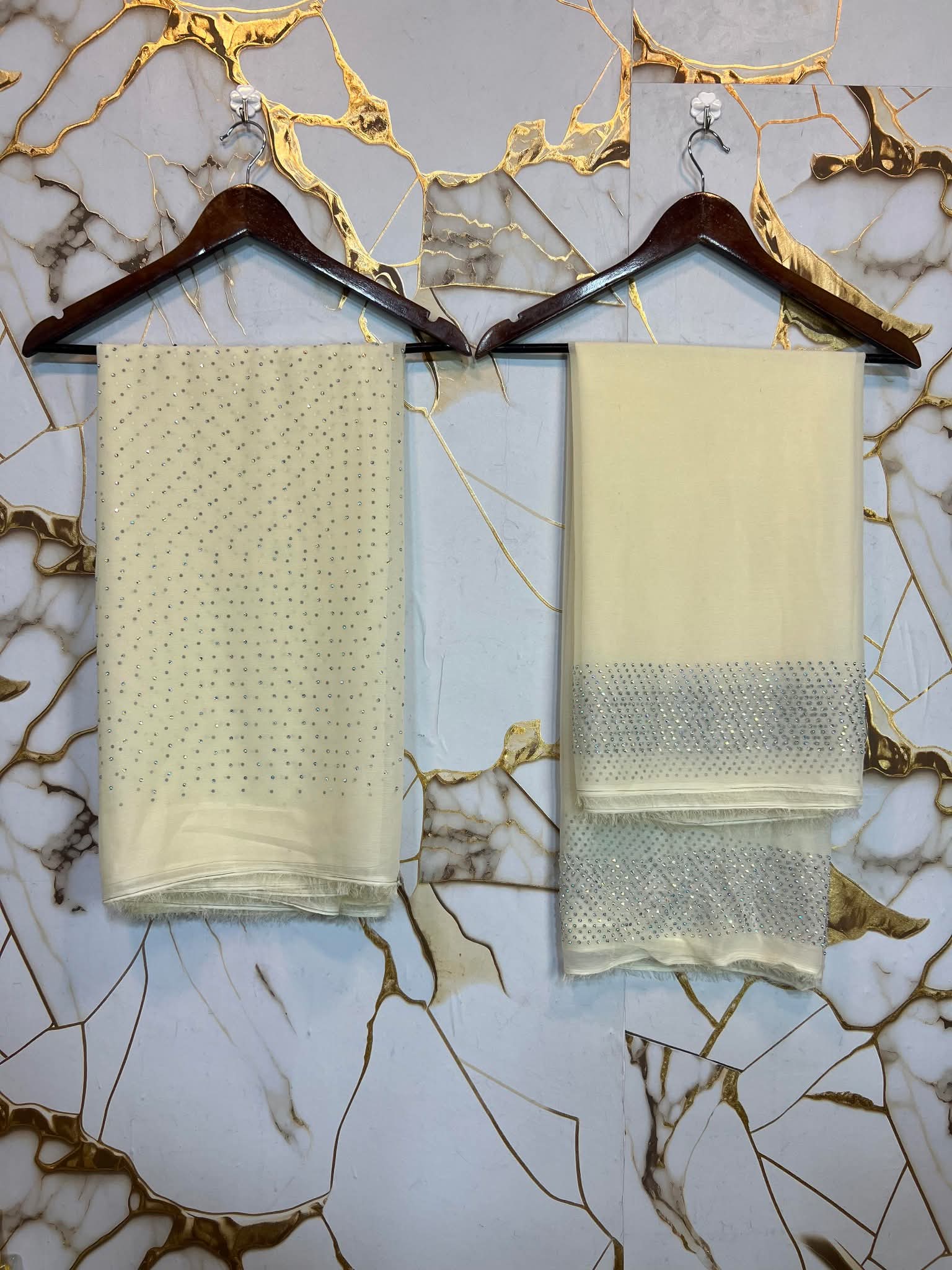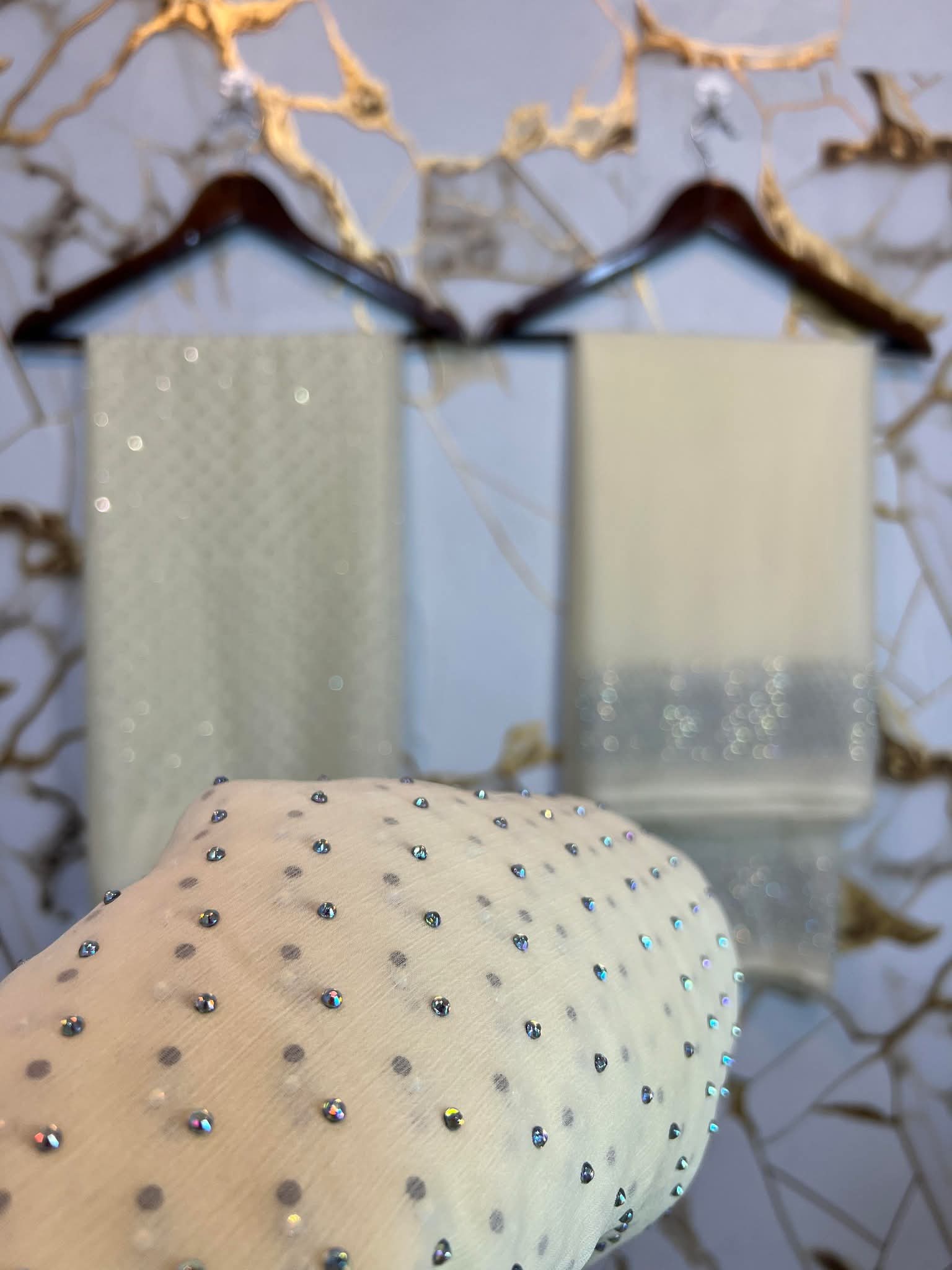 Product Details: Shirt: 2.5 yards, Length: 43 inches, Pure chiffon with full crystal work.Dupatta: 2.5 yards, Length: 43 inches, Heavy crystal work with double borders.Trouser: 2.5 yards heavy malai Twilight Sparkle - Premium Chiffon Dress with Crystal Work Introducing the stunning "Twilight Sparkle" ensemble, a luxurious three-piece set designed to dazzle. The shirt is crafted from pure chiffon with a bember finish and features intricate crystal work all over for a radiant, sparkling effect. The matching dupatta boasts heavy crystal detailing with a double border, enhancing its elegance. The premium quality heavy malai trouser and inner ensure a comfortable and sophisticated fit.