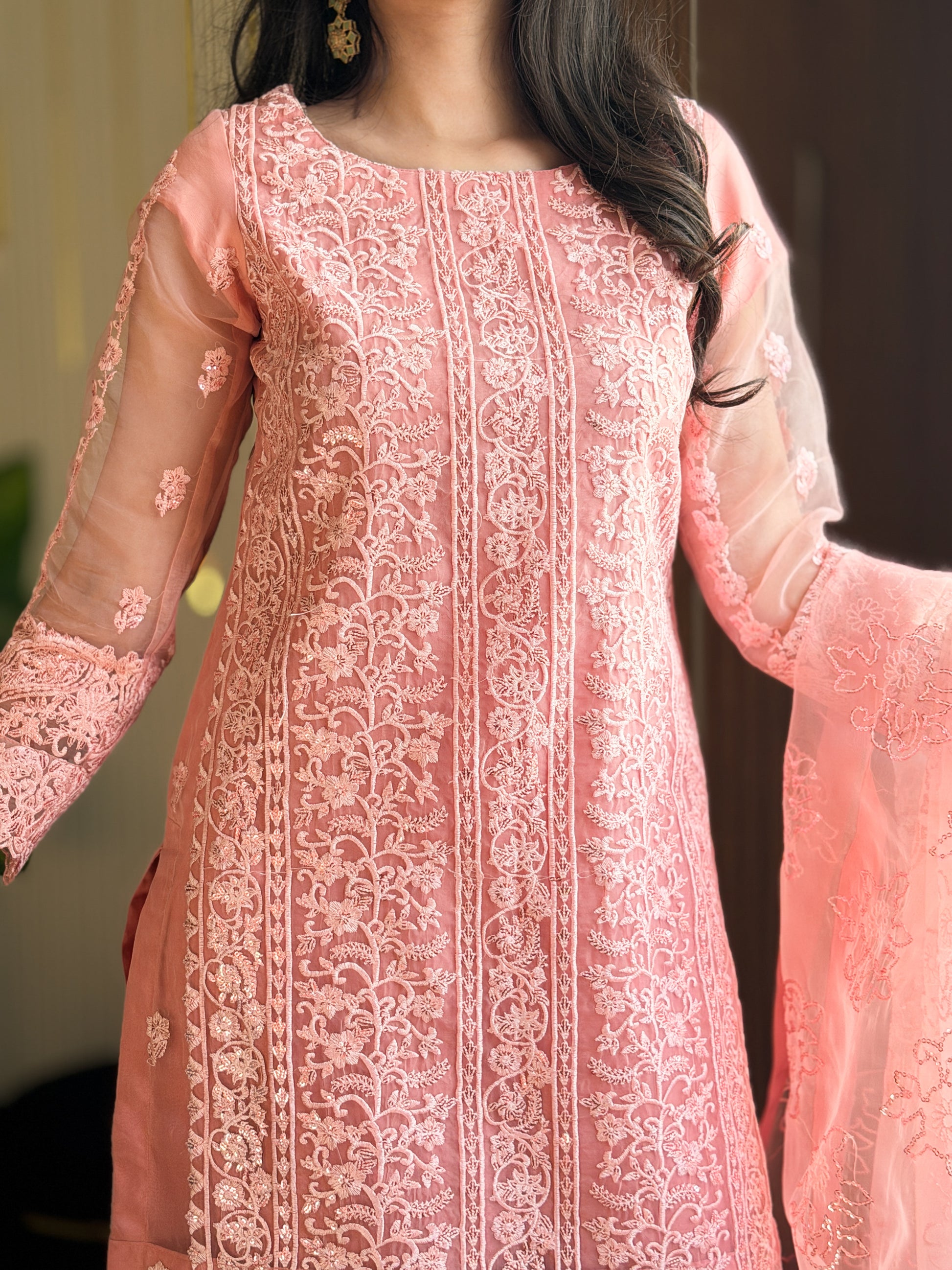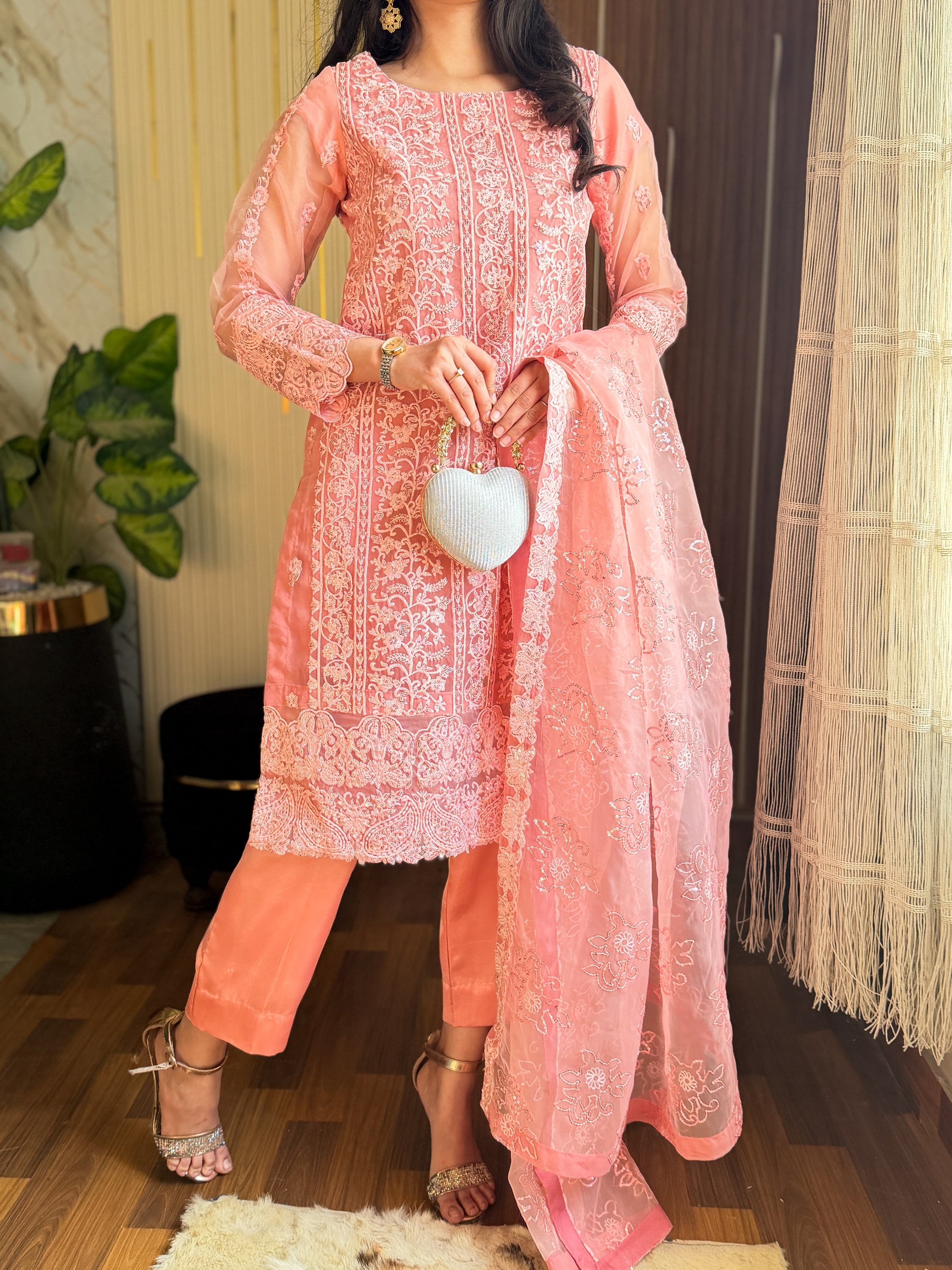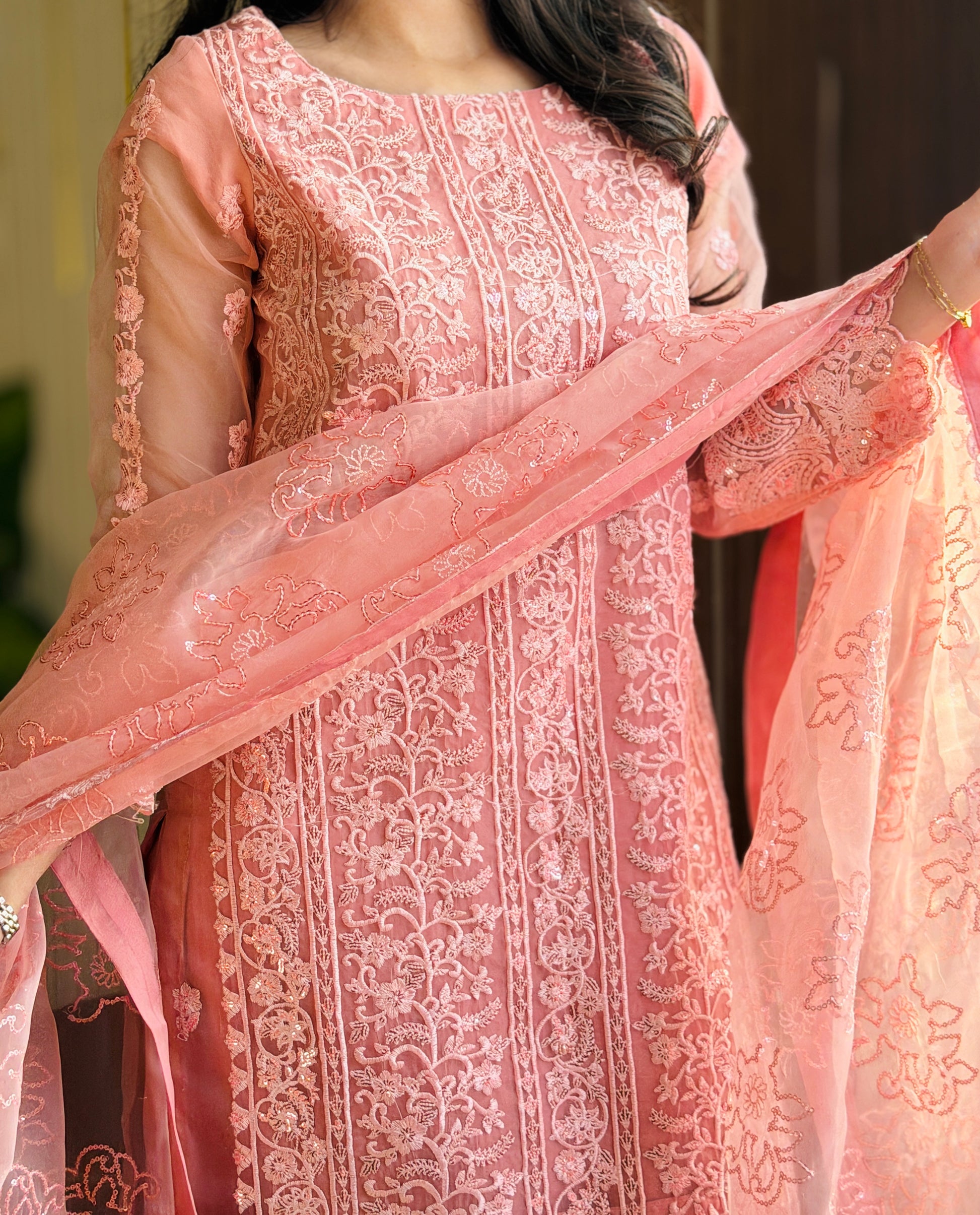 Fabric : Organza (UNSTICHED) Full Heavy Sequins Embroidered Front WithEmbroidered Daman PattaFull Embroidered Back withBack Embroidered pattaEmbroidered Sleeves Dyed Silk Trouser with Embroidered Trouser PattaFull Embroidered Sequins Dupatta